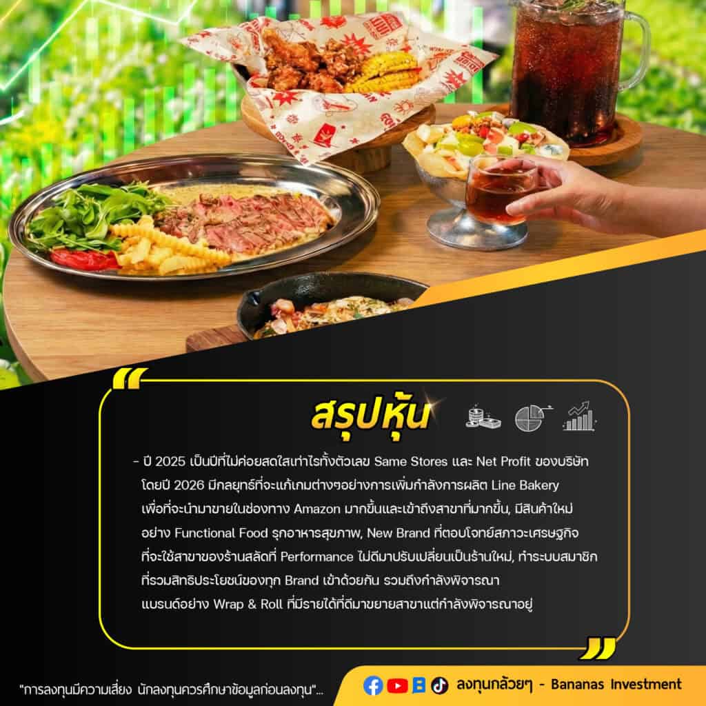 • ปี 2025 เป็นปีที่ไม่ค่อยสดใสเท่าไรทั้งตัวเลข Same Stores และ Net Profit ของบริษัทโดยปี 2026 มีกลยุทธ์ที่จะแก้เกมต่างๆอย่างการเพิ่มกำลังการผลิต Line Bakery เพื่อที่จะนำมาขายในช่องทาง Amazon มากขึ้นและเข้าถึงสาขาที่มากขึ้น, มีสินค้าใหม่อย่าง Functional Food รุกอาหารสุขภาพ, New Brand ที่ตอบโจทย์สภาวะเศรษฐกิจที่จะใช้สาขาของร้านสลัดที่ Performance ไม่ดีมาปรับเปลี่ยนเป็นร้านใหม่, ทำระบบสมาชิกที่รวมสิทธิประโยชน์ของทุก Brand เข้าด้วยกัน รวมถึงกำลังพิจารณา แบรนด์อย่าง Wrap & Roll ที่มีรายได้ที่ดีมาขยายสาขาแต่กำลังพิจารณาอยู่