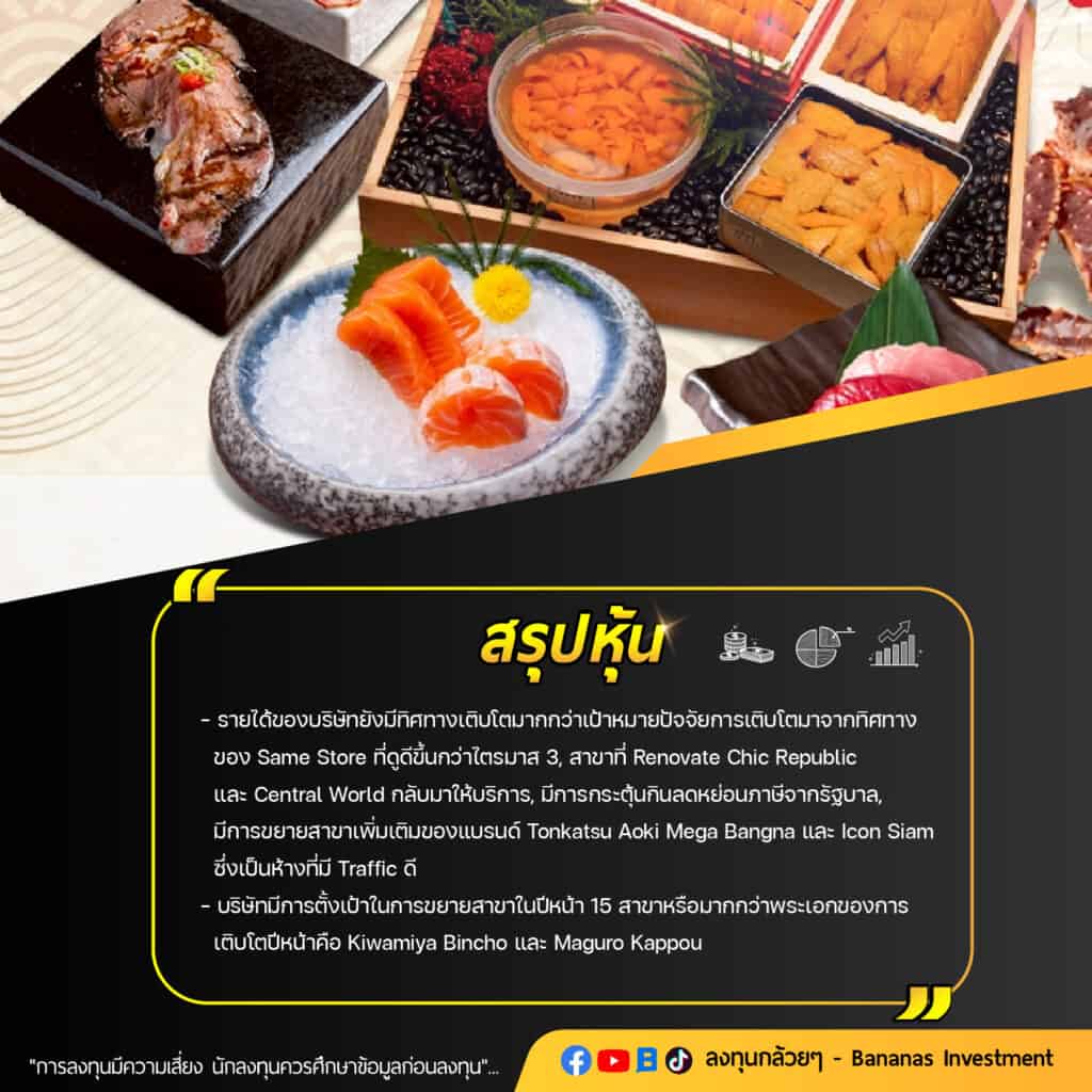 – บริษัทมีการตั้งเป้าในการขยายสาขาในปีหน้า 15 สาขาหรือมากกว่าพระเอกของการเติบโตปีหน้าคือ Kiwamiya Bincho และ Maguro Kappou