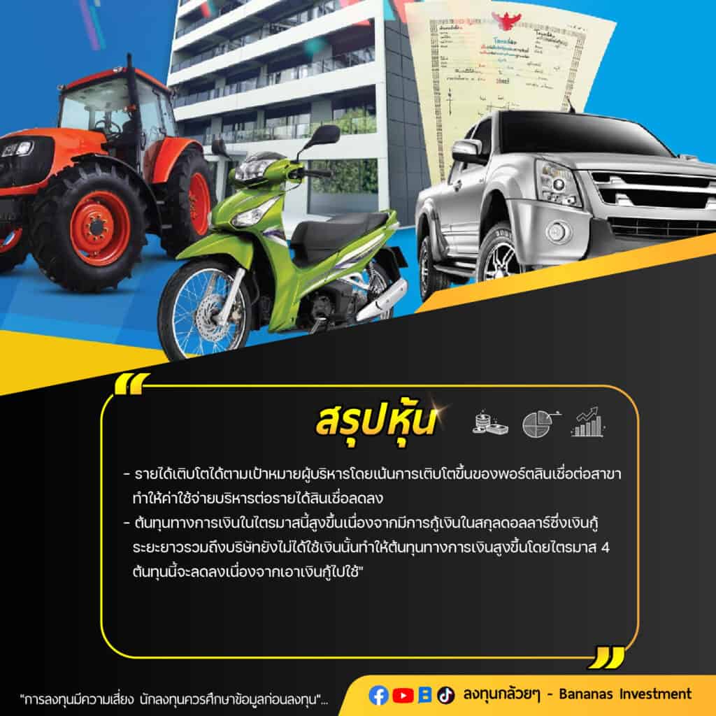 – รายได้สินเชื่อเติบโตขึ้นจากสินเชื่อจำนำทะเบียนโดยพอร์ตสินเชื่อมีการเติบโต +13%