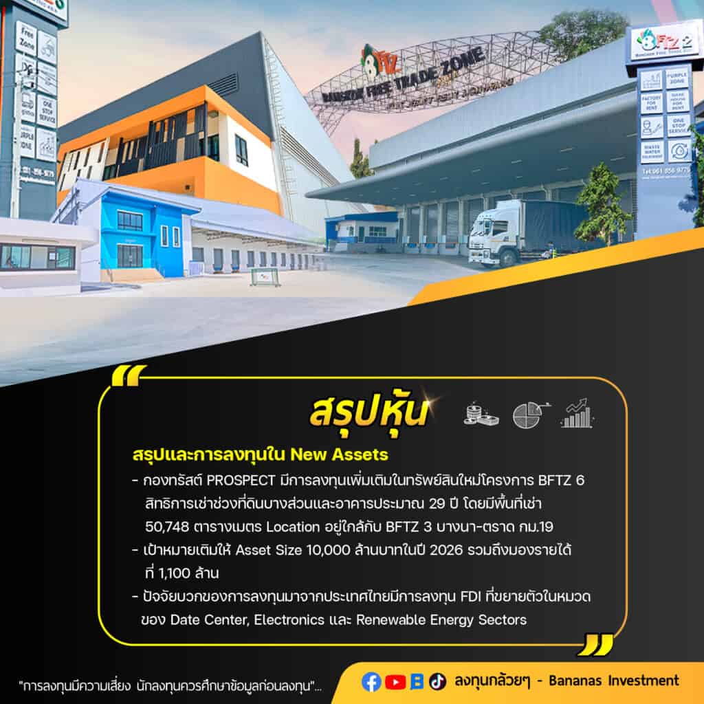 – กองทรัสต์ PROSPECT มีการลงทุนเพิ่มเติมในทรัพย์สินใหม่โครงการ BFTZ 6 สิทธิการเช่าช่วงที่ดินบางส่วนและอาคารประมาณ 29 ปี โดยมีพื้นที่เช่า 50,748 ตารางเมตร Location อยู่ใกล้กับ BFTZ 3 บางนา-ตราด กม.19