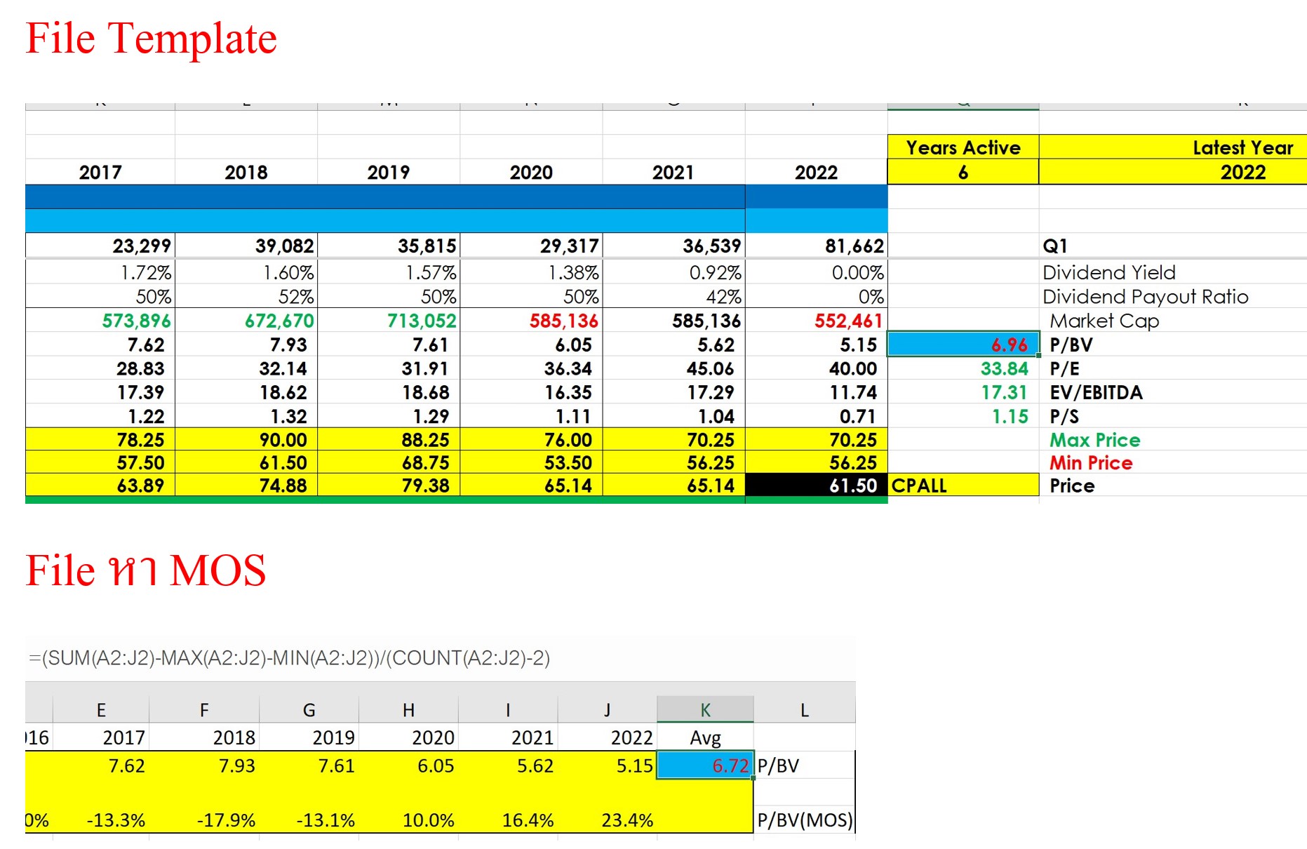 2 (ตามรูปแนบ) ไม่เข้าใจว่า ทำไม เอาตัวเลขแต่ละปี P/BV(จาก File Template) ตั้งแต่ปี 2017 ถึง 2022 เข้าไปใส่ใน File หา Mos ตั้งแต่ปี 2017 ถึง 2022(ตามรูปแนบ) ค่าที่ได้ถึงไม่เท่ากันครับ p/bv(จาก file template) = 6.96 แต่ p/bv(จาก file หา Mos) = 6.72