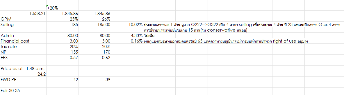 เพิ่มเหตุผลให้นิดนึงสำหรับ GPM ครับ คิดว่า 25% ถึงแน่ๆเพราะบริษัทน่าจะได้รับส่วนลดมากขึ้นจาก supplier เหมือนตอน Q4 และยิ่งมีการขยายสาขาเพิ่มขึ้นอีกส่วนถ้าจะวิ่งไปถึง 26% เลยคิดว่าสินค้า healthiness ที่เป็น own brand อาจจะต้องมีสัดส่วนเพิ่มขึ้นพอสมควรอาจจะวิ่งขึ้นมาถึง 26% ได้ครับ ผมมองๆไว้คิดว่า GPM maximum อาจจะได้ไม่เกิน 35% รึป่าวครับเพราะเคยฟังผู้บริหารให้สัมภาษณ์บอกว่าตอนนี้ส่วนลดที่ได้จาก supplier นี่ค่อนข้างอยู่ในระดับสูงมากๆแล้ว เลยคิดว่าถ้าจะสามารถ improve net profit ได้มากขึ้นคือการเติบโตของ top line และการปรับลดลงของ SG&A จากการยกเลิกการใช้ outsouce แล้วทำ logistic เองทั้งหมด(ไม่แน่ใจว่าจะดีกว่าไหมเพราะตอนนี้เหมือนบริษัทจะใช้ zuellig pharma เหมือนของ IP)