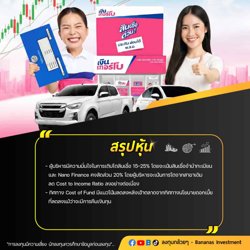 - รายได้ดอกเบี้ยเติบโตขึ้นจากการกลับมาเริ่มปล่อยสินเชื่อเน้นพอร์ตจำนำทะเบียนรถ